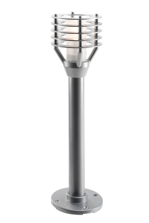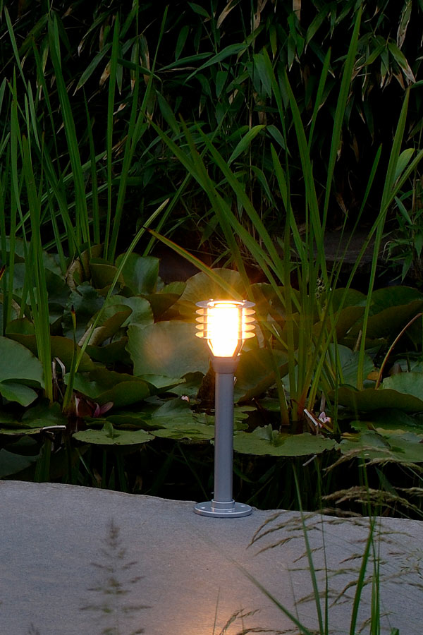 Alumínium, modern, hengeres, kerti állólámpa, tejfehér lámpafejjel 36,5 cm x 10 cm méretben, 1,5W-os fogyasztású meleg fehér LED izzóval, 90 lumen fényerővel. A Gardenlights 12V-os biztonságos kerti világításrendszerbe integrálható kerti lámpa.